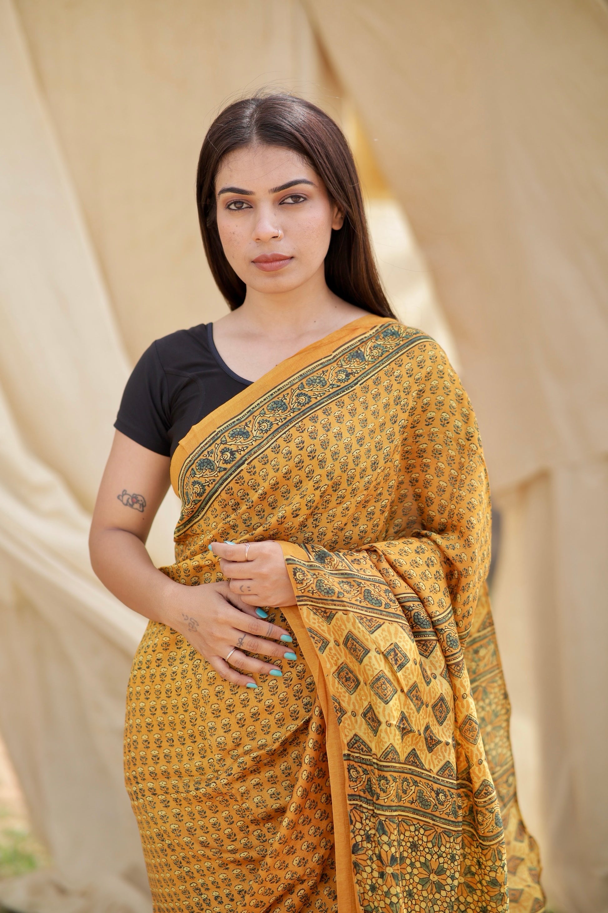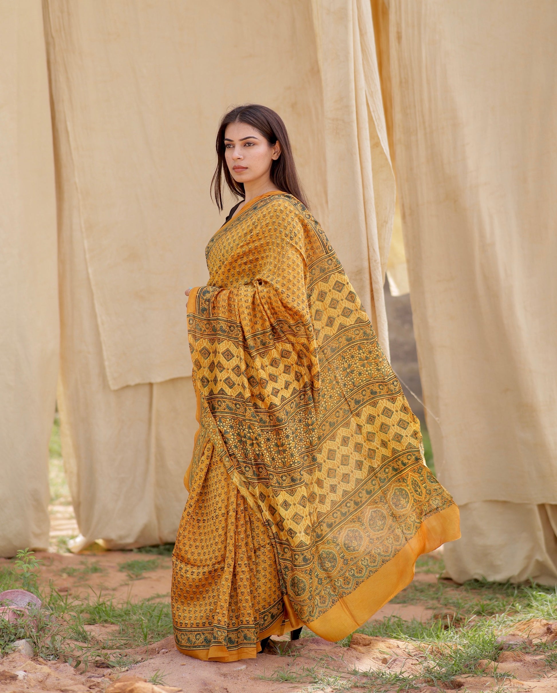 The magic of natural dyes in Handblock Ajrakh extends beyond aesthetics. In winter, the fabric's pores close, offering warmth, while in summer, they expand, facilitating airflow. This dynamic quality makes Ajrakh a versatile choice, suitable for year-round wear, blending comfort and style seamlessly.