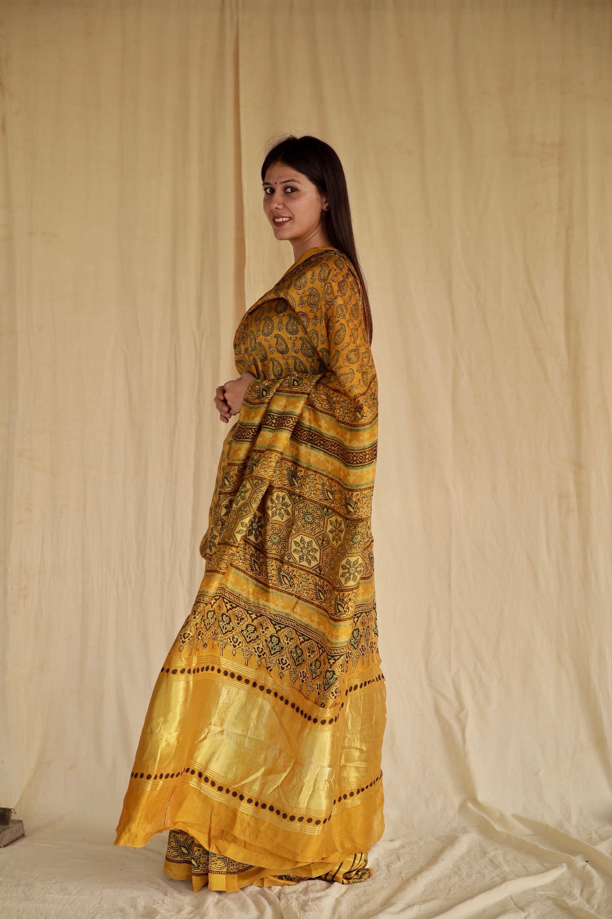 The magic of natural dyes in Handblock Ajrakh extends beyond aesthetics. In winter, the fabric's pores close, offering warmth, while in summer, they expand, facilitating airflow. This dynamic quality makes Ajrakh a versatile choice, suitable for year-round wear, blending comfort and style seamlessly.