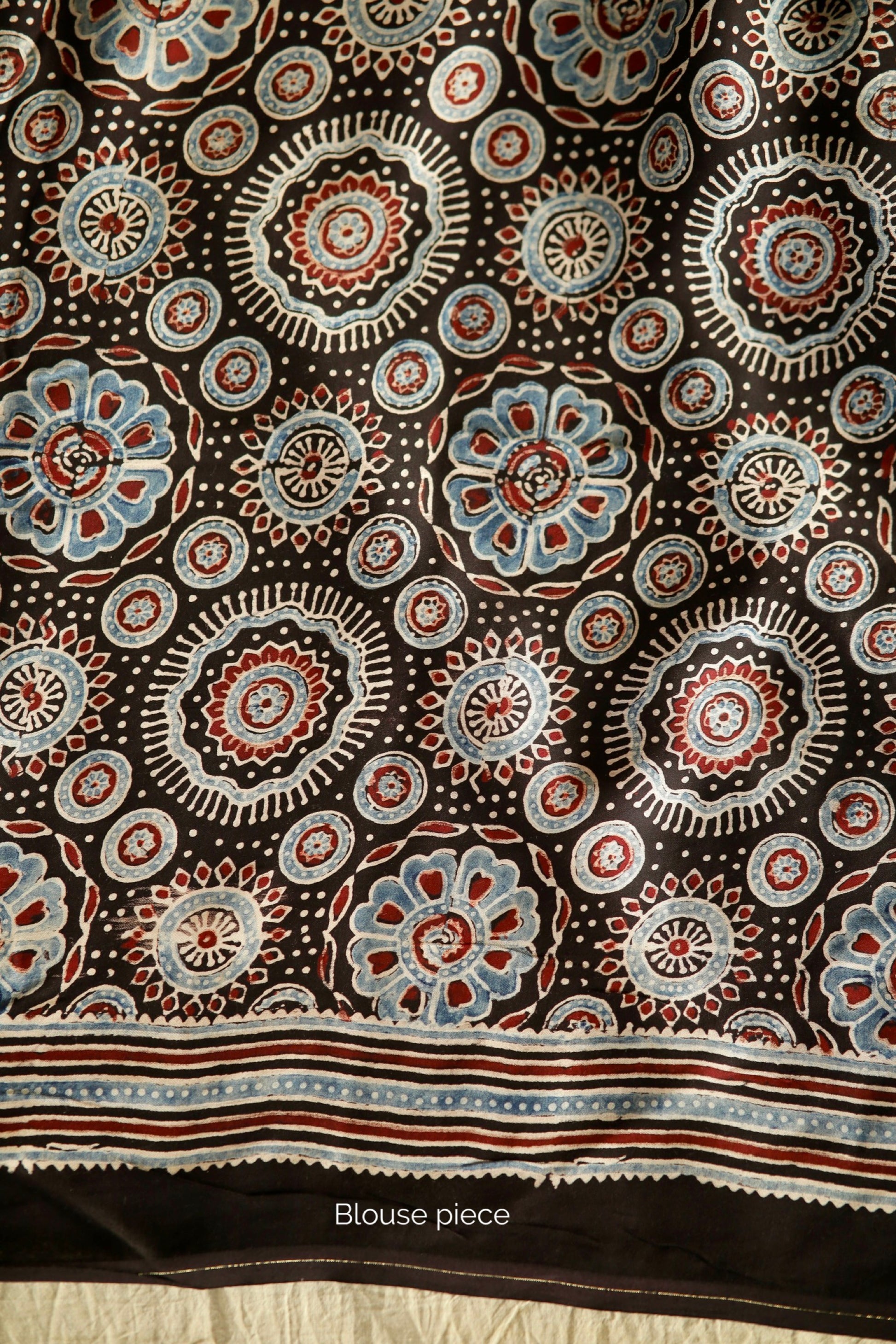 The creation of an Ajrakh cloth is a meticulous journey of craftsmanship. The process undergoes a series of rigorous steps, including exhaustive pulling, scouring, beating, and steaming the fabric. Each stage is repeated with different dyes, contributing to the intricate layers of the final pattern. The patience of the artisan plays a crucial role, as the gradual process, coupled with waiting periods between steps, enhances the vibrancy of the print.