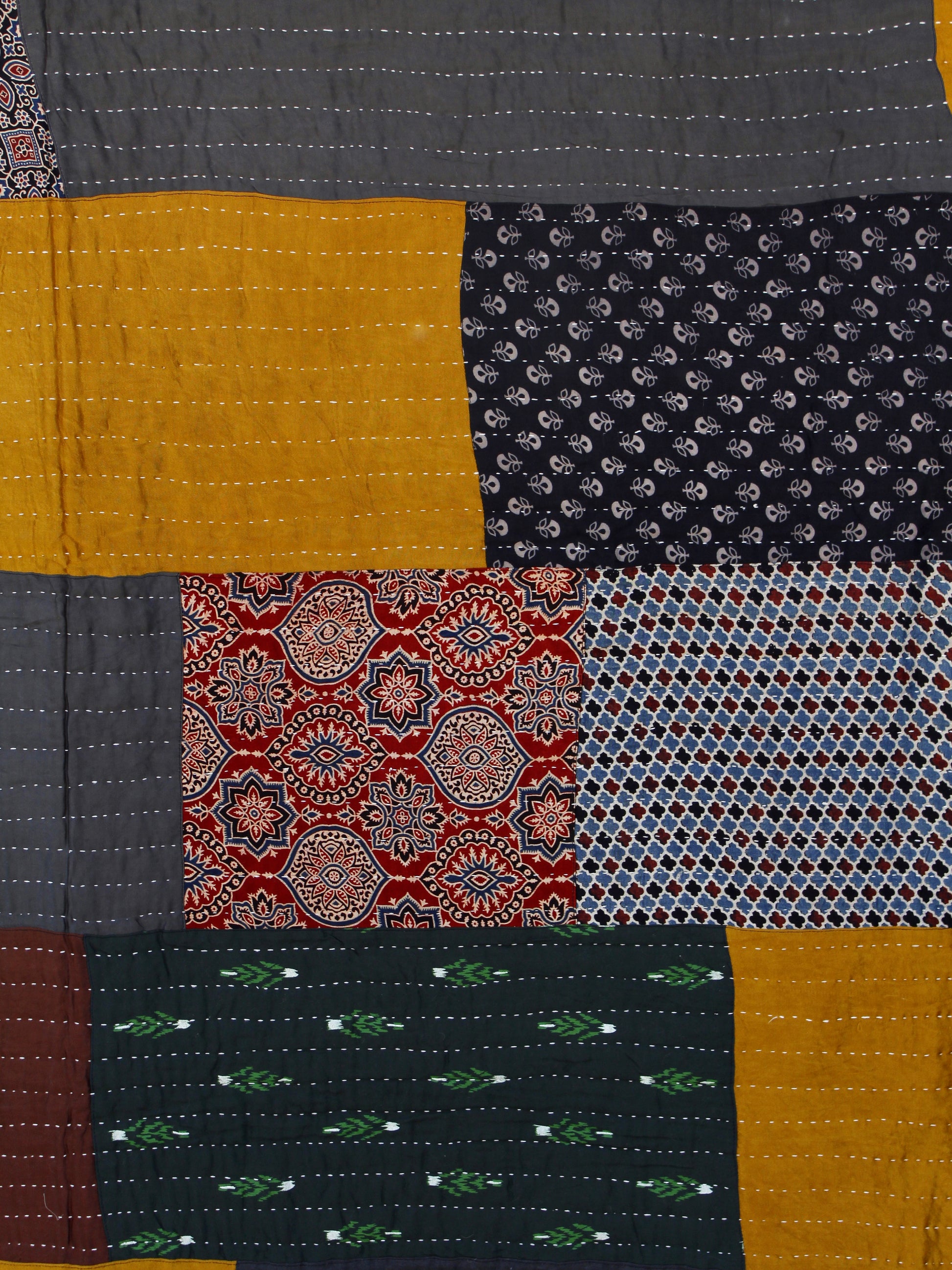 The process begins with a rural woman collecting pieces of raw cotton and fabric scraps from around her household. This Quilt is finely hand stitched by rural women and block printed with hand carved wooden blocks by Ajrakh craftsmen in the hues of these vibrant colours.